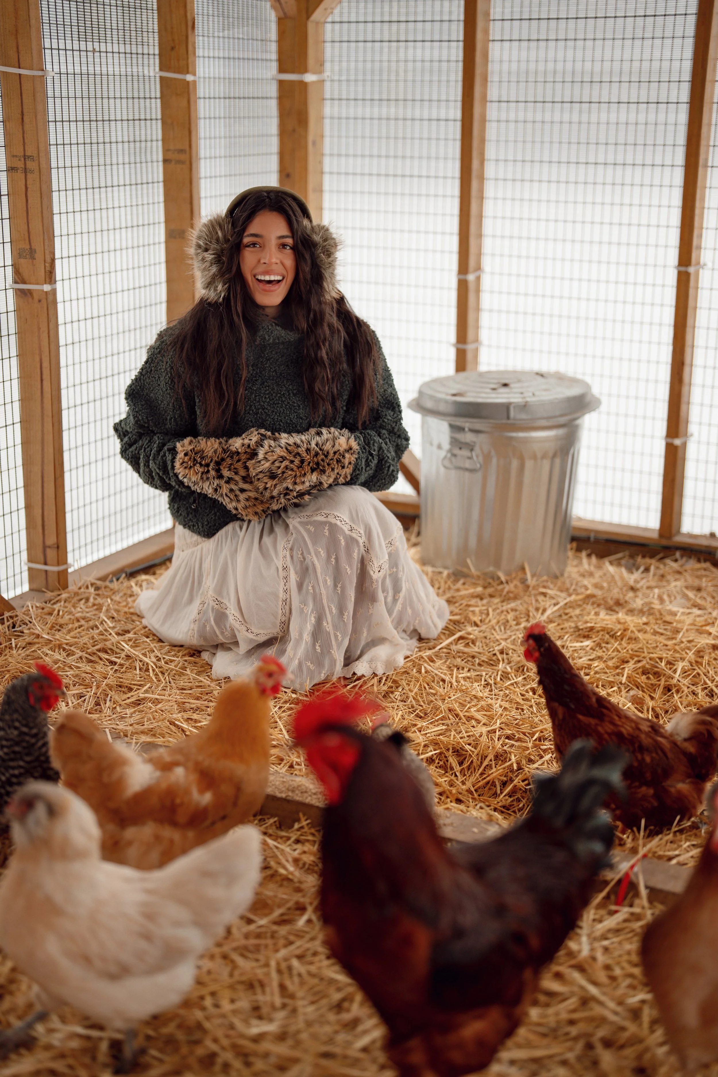 Preparing the coop for cold temperatures is one of our most important winter tasks. I attached greenhouse plastic on all sides of the run to block drafts, and added deep bedding using straw and wood shavings to help regulate warmth naturally. As the bedding builds up over time, it creates gentle heat through decomposition.